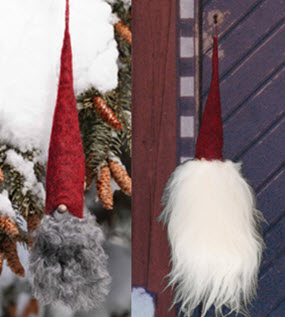 Red Capped Tomten. Beautiful red caps made of boiled wool and fleecy beards. Hand-made in Sweden.